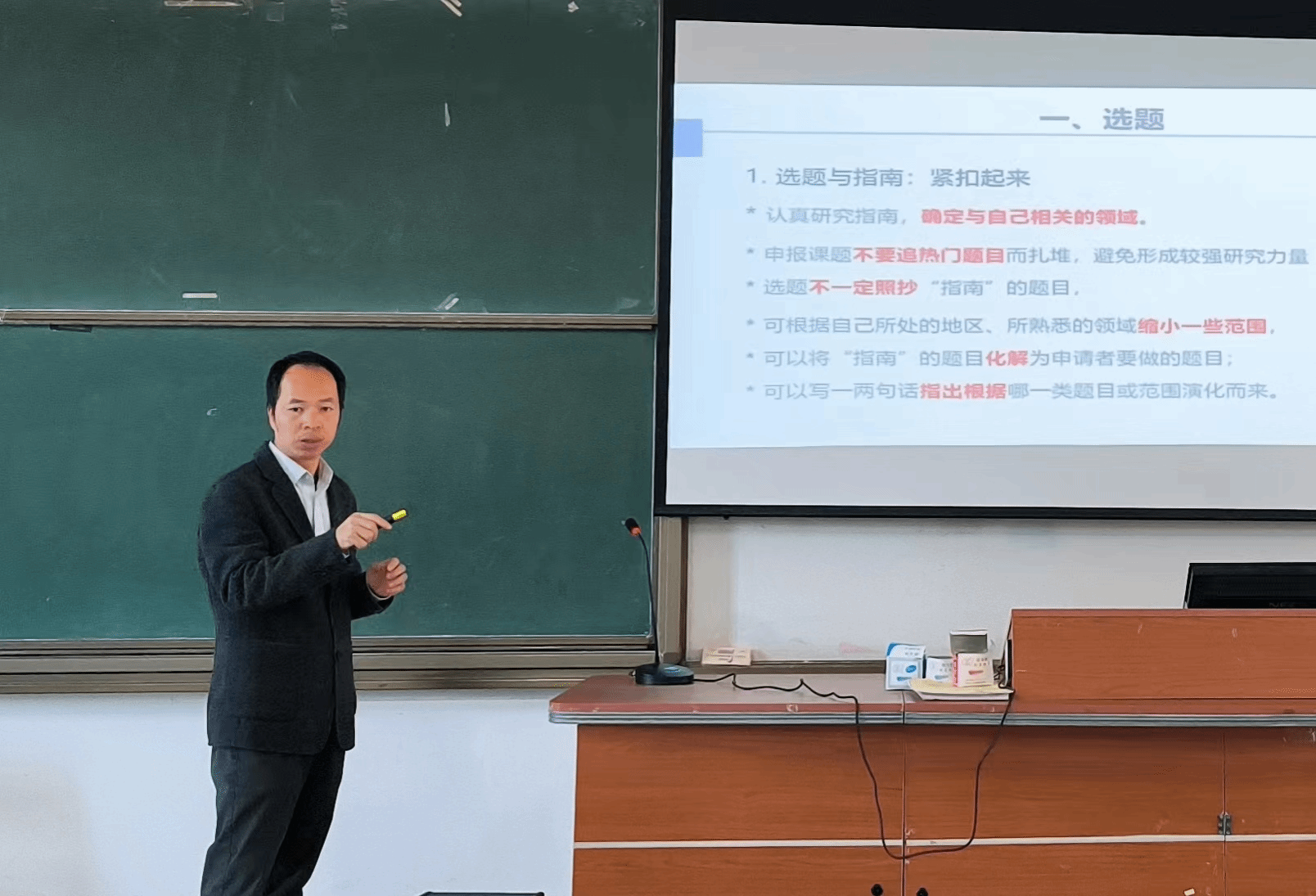 吴鼎铭副教授着重阐述后期项目与国社其他年度项目的区别以及后期项目的分类情况,总结了后期项目的申报时间和途径,对申报关键点和限制条件详细说明。根据后期项目入选数据分析,并根据成果特点总结申报书填写要领。