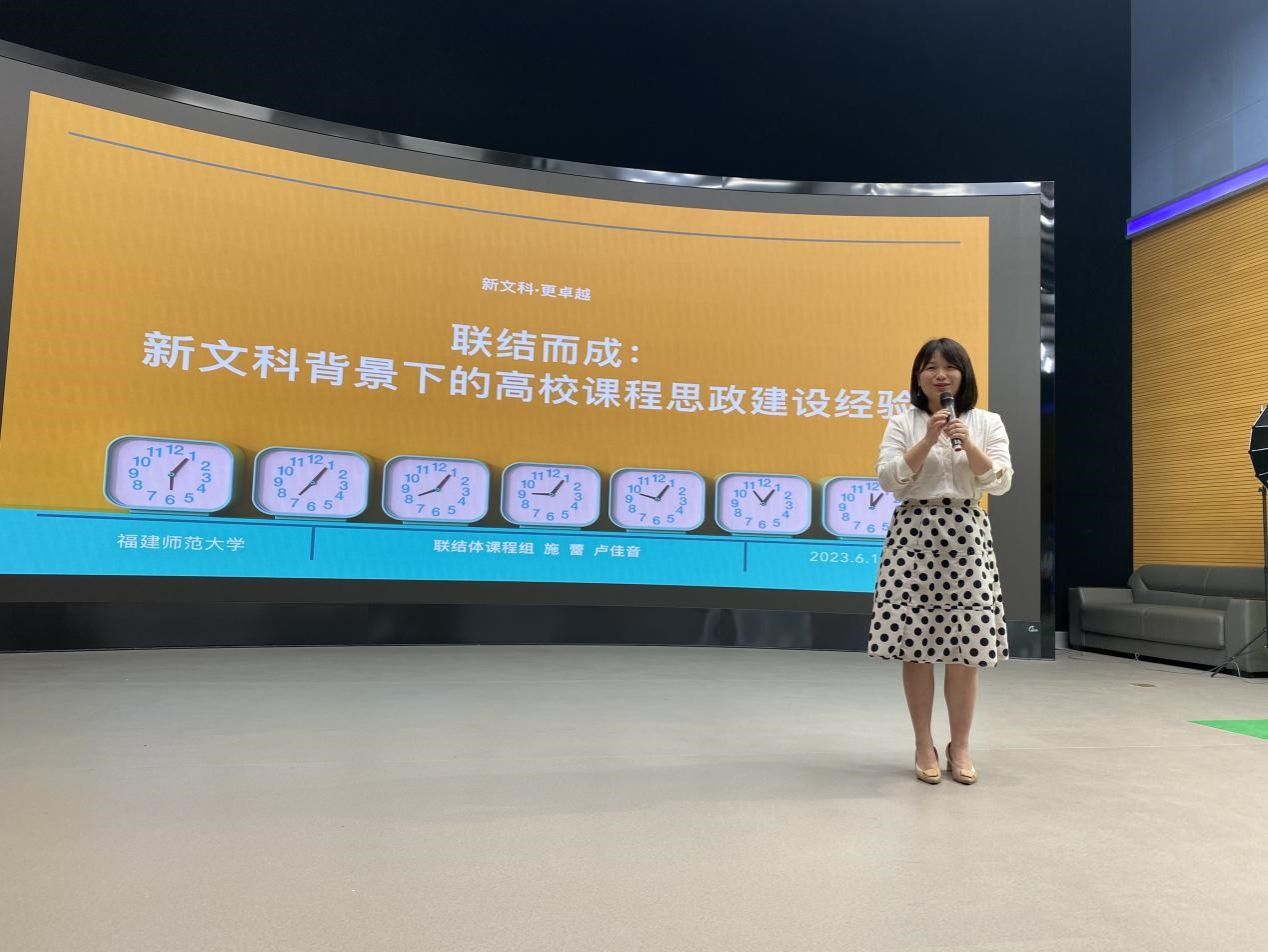 “课程思政不等于专业课加上思政课程,而是要紧紧围绕坚定员工理想信念,以爱党、爱国、爱社会主义、爱人民、爱集体为主线,围绕政治认同、家国情怀、文化素养、宪法法治意识、道德修养等重点优化课程思政内容供给。”施蕾老师结合自身依托课程开展的新文科跨学科跨专业“联结体课程组”教学改革经验与入选的“福建省课程思政优秀教学案例”,深入浅出地讲解了如何通过跨课程合作的方式,打造“以服务福建、面向全国为目标,打破学科专业壁垒,探索以文艺融合为基础、以理工支撑为背景、以历史文化为底蕴、以视听强化为特色的多学科交叉融合模式。”同时,思政元素的切入有四种重要方式,即“社会发展现实、乡村振兴事业、红色文化传播以及传统文化创新”。最后,施蕾老师还同与会的青年教师进行了思政方面的互动交流。