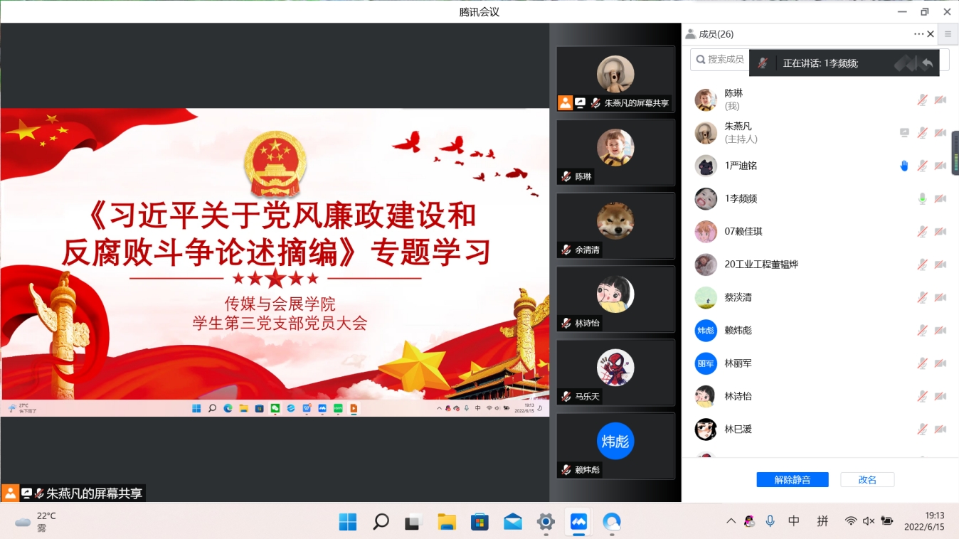 为加强支部党员对党风廉政建设的认识,进一步引导毕业生党员筑牢思想道德防线,强化纪律意识,增强廉洁从政的自觉性,2022年6月15日,bwin必赢员工第三党支部开展党风廉政教育线上学习活动,全体党员参与本次活动。