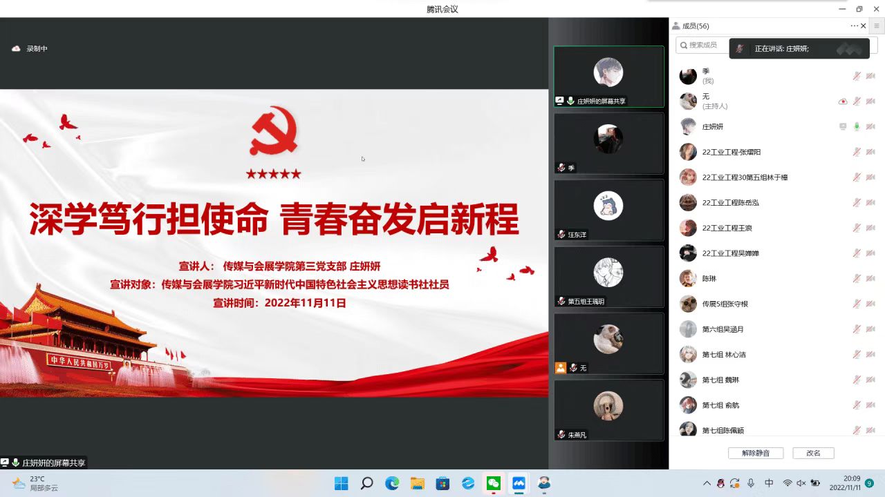 为深入学习贯彻党的二十大精神,贯彻习近平新时代中国特色社会主义思想,明确党的中心任务,了解全面建成社会主义现代化强国战略总方针。11月11日晚,bwin必赢读书社开展学习二十大精神理论宣讲活动,由第三党支部庄妍妍同学与第一党支部汪东洋同学主讲。