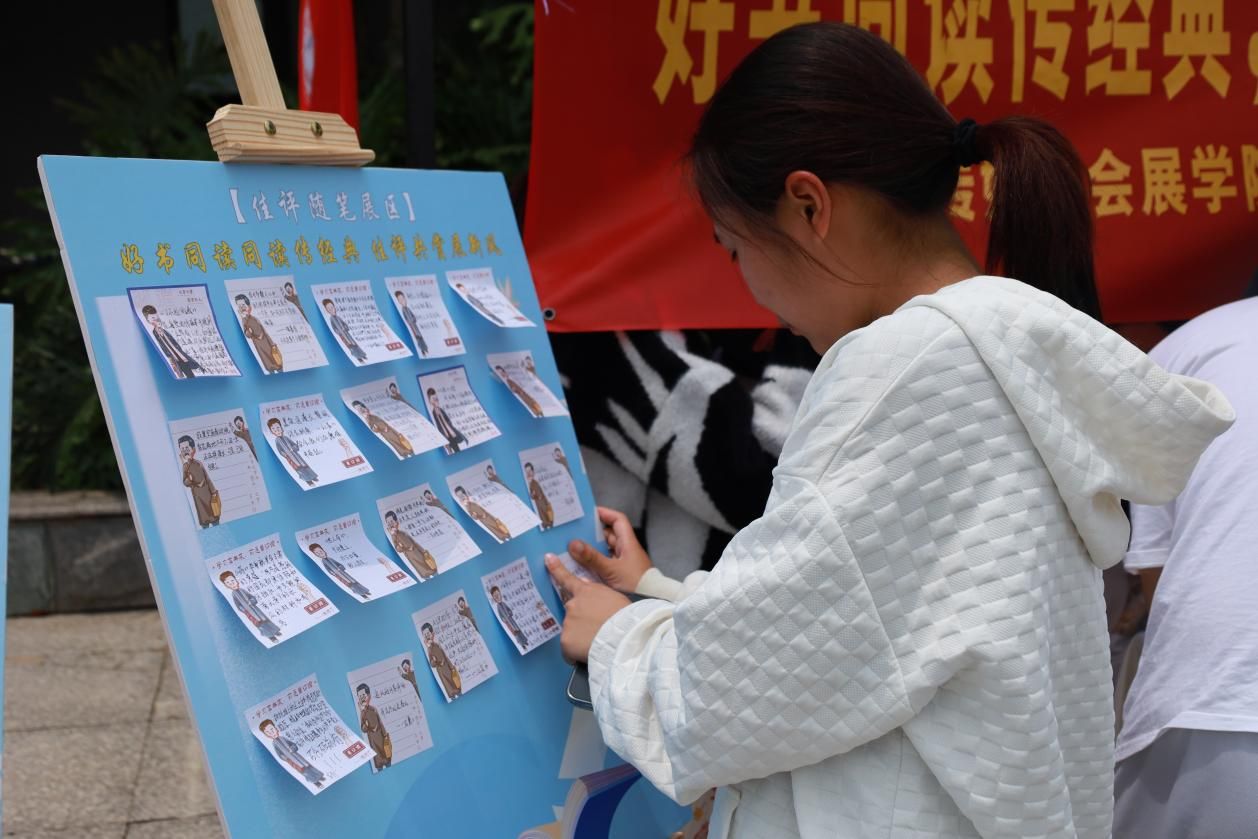 活动围绕“好书同读、经典共阅”和“美文同享、佳评共赏”两项内容,开展红色经典共读和书评佳句分享活动,为全校师生提供《习近平用典》《中国共产党创立之路》《红色家书》等经典书籍两百余册,供现场阅读与共享借阅。师生阅读后可到书评佳句分享区书写阅读感想,将所学所知所想转化为文字与现场师生共享。