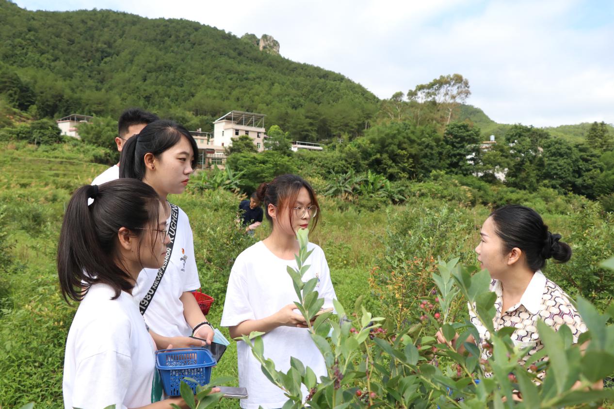 下午,实践团面对面采访蓝莓基地负责人曹新英女士。曹新英女士为实践团师生讲述其为照顾父母,响应政府扶持政策回村创业,带动乡亲们共同致富的创业经历及打造绿色无公害,原生态种植、品质优异的基地蓝莓的创业初心。曹新英女士以其自身经历诠释了吃苦耐劳、艰苦奋斗、努力拼搏的客家精神。