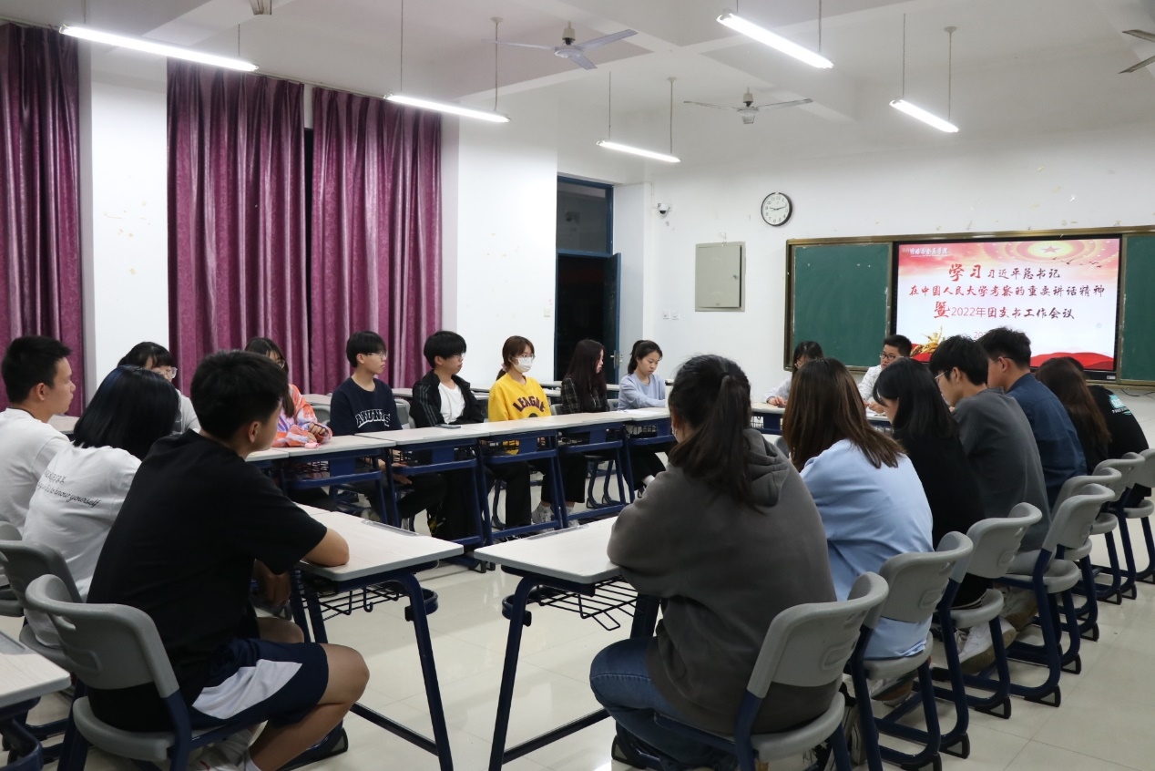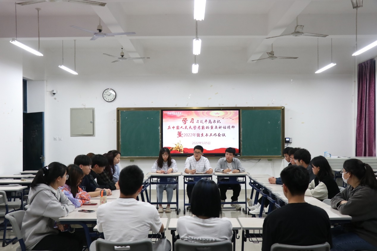 2022年5月5日晚,bwin必赢学习习近平总书记在中国人民大学考察的重要讲话精神暨2022年团支书工作会于诚信楼302室召开。会议由院团委书记胡瑞安主持,团委部门负责人和20、21级各班团支部书记参会。