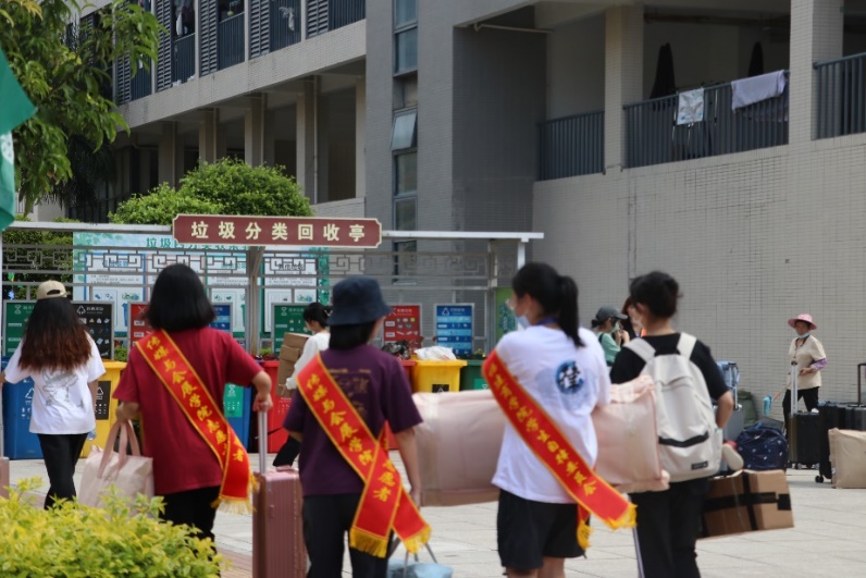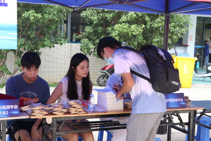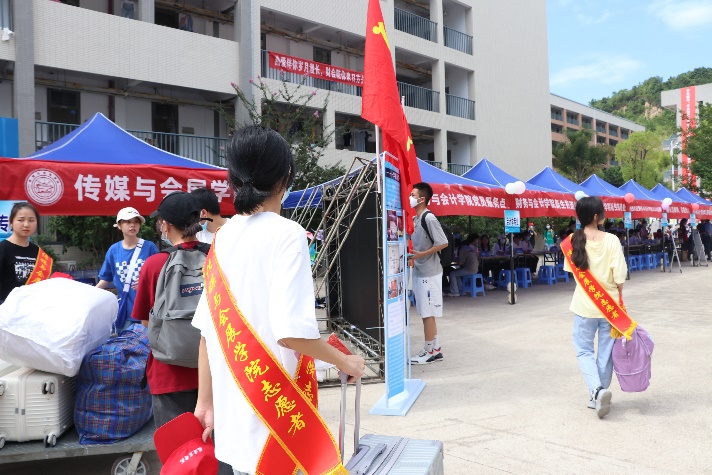 为了更加顺利地迎接新生的到来,志愿者早早地布置好了场地,准备好小推车为新生搬运行李。新生陆续到来,学长学姐们不厌其烦地为他们解答着各种问题,志愿者们主动帮忙拎行李,沿路为他们介绍着校园。人头攒动,却又秩序井然。迎新现场挂满了横幅,广播里播放着欢快的曲调,迎新工作如火如荼地开展着,到处都是志愿者忙碌的身影,志愿者们用热情周到的服务消除了新生们初来乍到的陌生感。