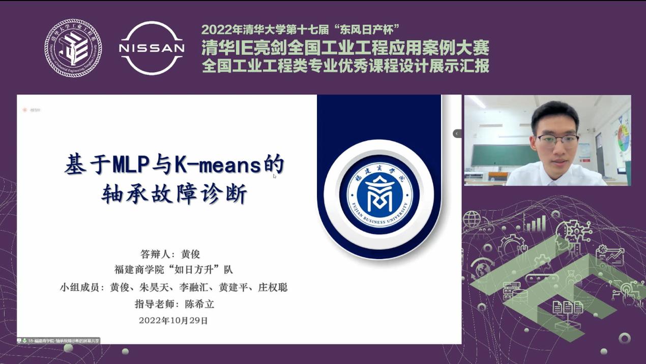 2022年10月29日,由公司工业创新学社的黄俊、朱昊天、李融汇、黄建平、庄权聪组成“如日方升”队,在陈希立老师的指导下,以“基于MLP与K-means的轴承故障诊断”项目参加“第十七届‘东风日产杯’清华IE亮剑全国工业工程应用案例大赛”,最终以决赛第五成绩荣获二等奖,实现了公司在该项赛事上的重大突破。