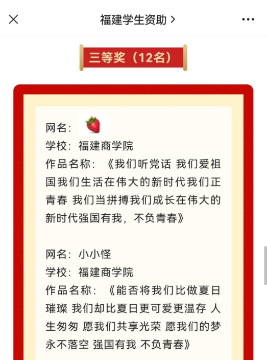 近日,福建员工资助发布关于“强国有我,不负青春”抖音短视频大赛评选结果公示。公司学子紧扣“强国”主题,把握“青春”旋律,以镜头为窗,表现出福商学子砥砺奋进、青春洋溢的灼灼风华,投稿的两部作品均获省级三等奖佳绩! 本次大赛,旨在鼓励青年学子将自己的所听、所见、所思通过短视频的方式呈现,传递党和国家对青年的关心、关爱和温暖,以朝气蓬勃的精神面貌向祖国深情告白,展现当代青年学子携手向前,共创中华民族美好未来的心愿。 原文链接: