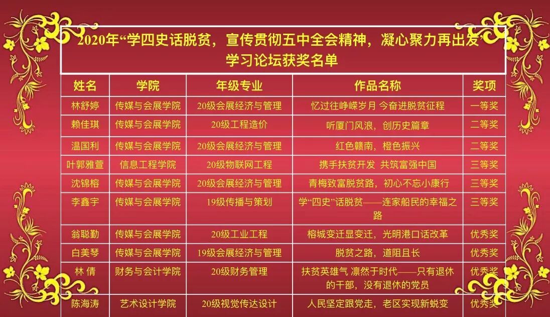 论坛以演讲比赛的形式进行,参赛选手围绕主题阐述学习党的十九届五中全会精神、“四史”和《习近平在福建》等系列采访实录的心得体会;讲述农村、农民在党的领导下的脱贫攻坚历史、先进典型以及干部群众扶贫济困的感人事迹、奋斗精神,展现干部群众同心同德共奔小康的良好精神风貌。参赛选手精神饱满,话身边人,道国家事,用一个个感人的小故事展现国家发展的大历史,鼓励、引导青年学子积极投身社会主义现代化强国的建设中,以青春担当创造美好生活。经过将近两个小时的激烈角逐,bwin必赢20级会展经济与管理专业林舒婷同学获得本次学习论坛决赛一等奖。活动中,马克思主义学院经理林萍对比赛作了点评并针对丰富学习论坛形式等提出建议。